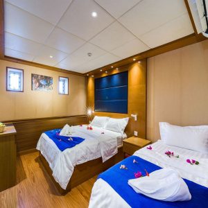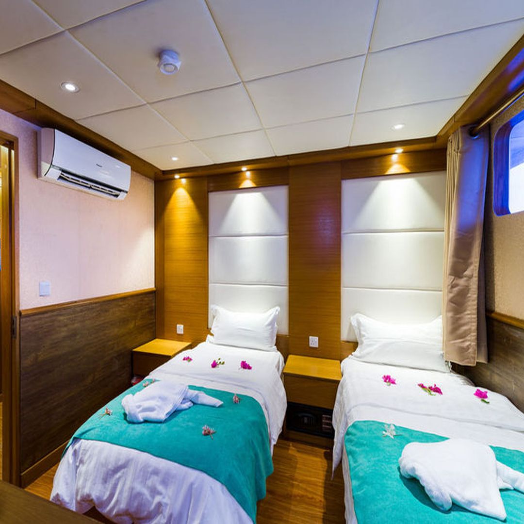 Konaklayacağımız tekne 37 metre uzunluğunda ve 11 metre genişliğinde olup toplam 24 kişilik kapasiteye sahiptir. Tüm odalarda özel tuvalet, duş ve bireysel kontrollü klima bulunmaktadır. Katlar arasında fiyat farkı mevcuttur. Bazı odalarda duş kabinine ek olarak küvet de bulunmaktadır.